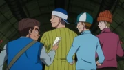 Leorio stops and looks at Gon, who has stopped beside him. Killua is waiting for Gon and tells him to forget Leorio and just continue, but Gon does not even move an inch, to Killua's incredulity. Leorio gains the motivation to catch up with them and starts running even ahead of Gon and Killua. Gon happily "fishes" for the briefcase Leorio dropped. Satotz starts speeding up his pace when they reach eighty kilometers, marked by a long, wide staircase. Leorio now has kept up with Kurapika, who asks him if he is alright. Leorio tells him that he can keep up if he does not mind how stupid he looks, for he has taken off his suit to make himself more comfortable. Kurapika follows his example by taking off his blue outer garment. Kurapika then asks Leorio if he really is after money, because he doesn't see Leorio as such a shallow person.